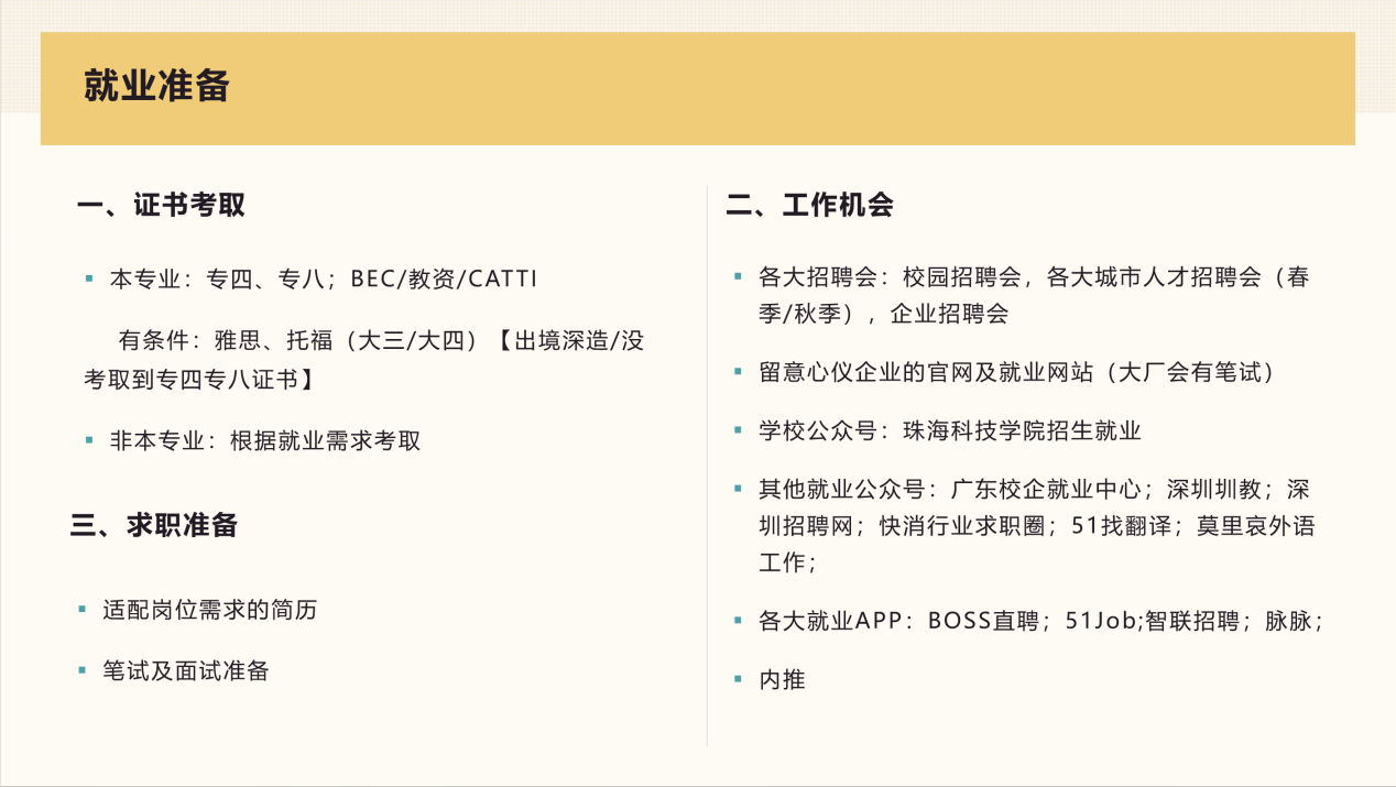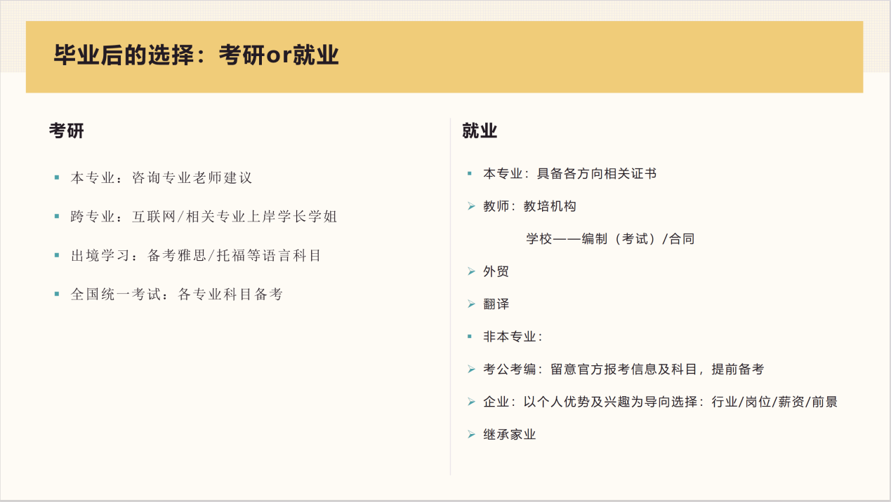 针对就业类别,尤婉玲分享了她的看法并给出了具体建议。就业大致可以分为本专业就业和跨专业就业两个大类。本专业就业应注重获取专业证书,如专四、专八、BEC 和CATTI等,以增加自己的就业硬实力。对于跨专业就业,她建议在校生以个人兴趣和岗位前景为依据,提前了解目标行业,明确必须的资格证书,并尽早准备。此外,跨专业就业还包括体制内就业,选择考编的同学可以考虑能够展示英语专业优势的岗位,以增加个人竞争力。