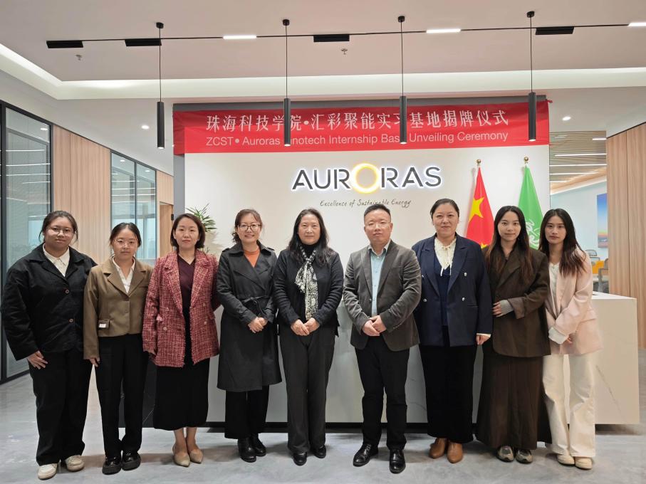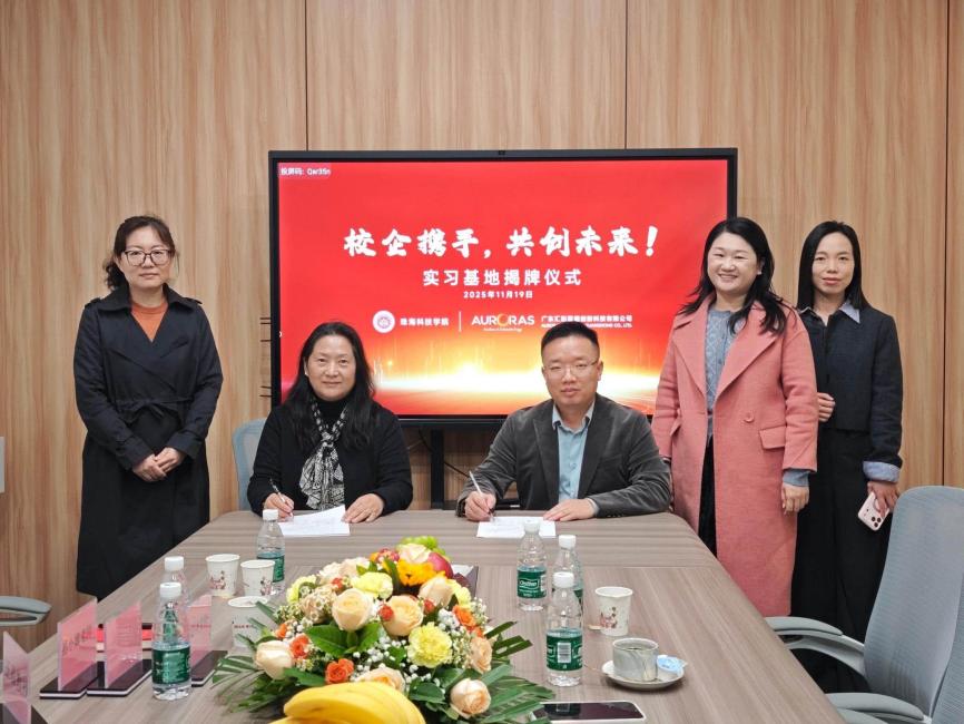 2025年11月19日,我院与广东汇彩聚能科技有限公司举行产学研实习基地签约暨挂牌仪式。香洲区科技和投资促进中心副主任邓行思、项目专员曾泳,汇彩聚能总经理郑锋涛、经理马晓艳,外国语学院院长王晶、副院长张岩、学工办主任黎达超、英语系主任孙小娜、商务英语系主任贾金祯共同出席仪式。